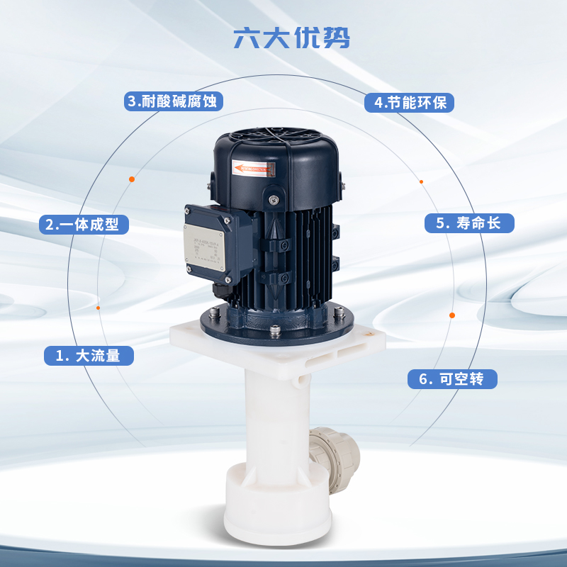 1、泵体采用PP/PVDF工程塑料射出成型,耐腐蚀,可空转运行; 2、适用于各种酸碱液体输送,低压喷淋,连续电镀等环境; 3、电机轴采用SUS不锈钢轴,电机轴采用高速对碰焊接轴工艺,保证长轴使用强度; 4、泵头组件完全模具化,标准化,拆装方便,便于维护保养。